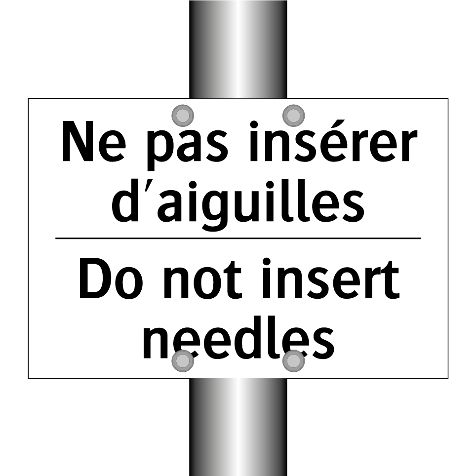 Panneau d'interdiction bilingue avec texte en français : "Ne pas insérer d'aiguilles", et en anglais : "Do not insert needles"