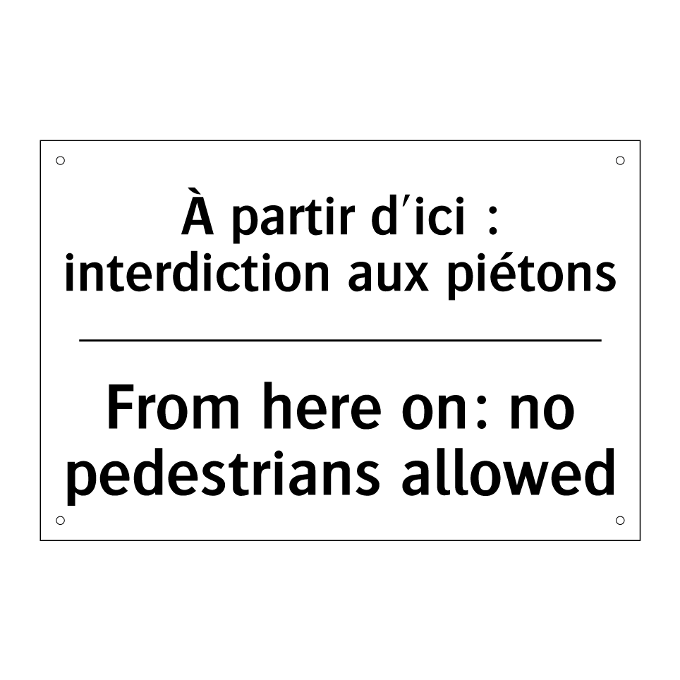 Panneau d'interdiction bilingue avec texte en français : "À partir d'ici : interdiction aux piétons", et en anglais : "From here on: no pedestrians allowed"