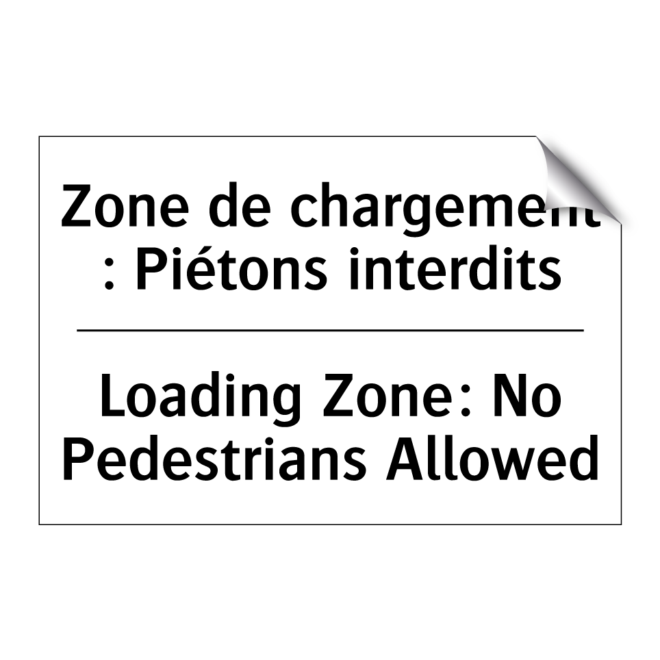 Panneau d'interdiction bilingue avec texte en français : "Zone de chargement : Piétons interdits", et en anglais : "Loading Zone: No Pedestrians Allowed"