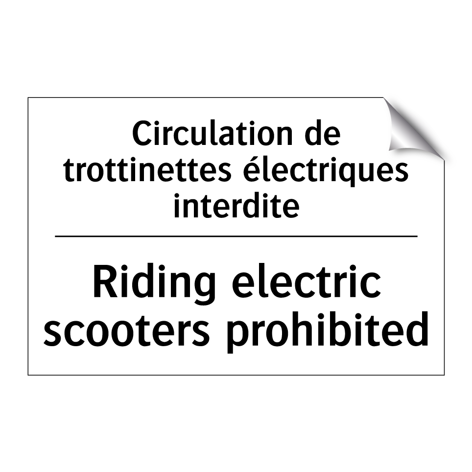 Panneau d'interdiction bilingue avec texte en français : "Circulation de trottinettes électriques interdite", et en anglais : "Riding electric scooters prohibited"