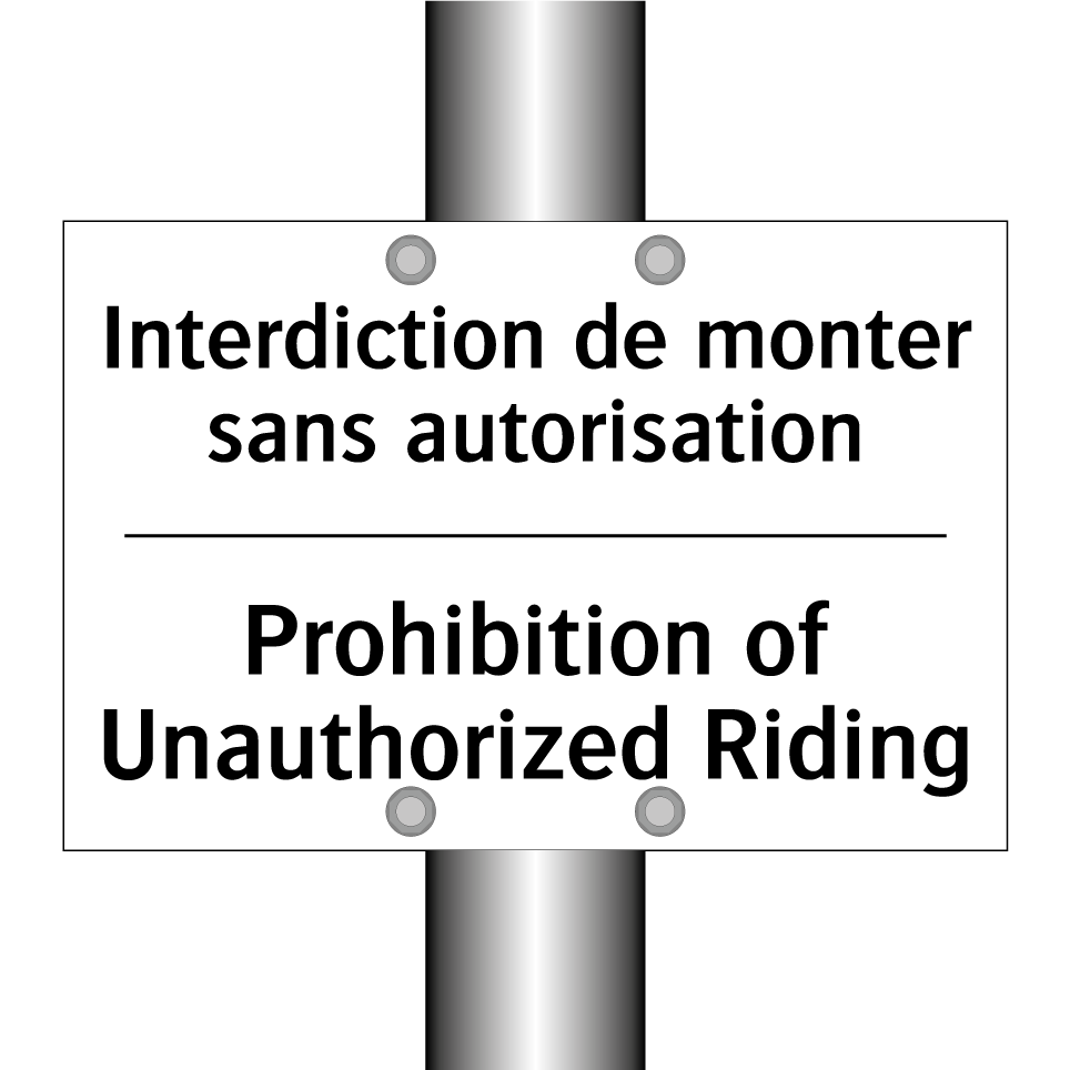 Panneau d'interdiction bilingue avec texte en français : "Interdiction de monter sans autorisation", et en anglais : "Prohibition of Unauthorized Riding"