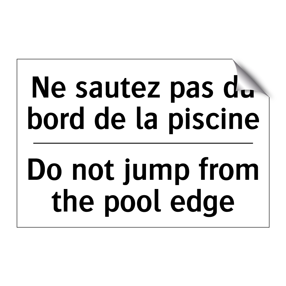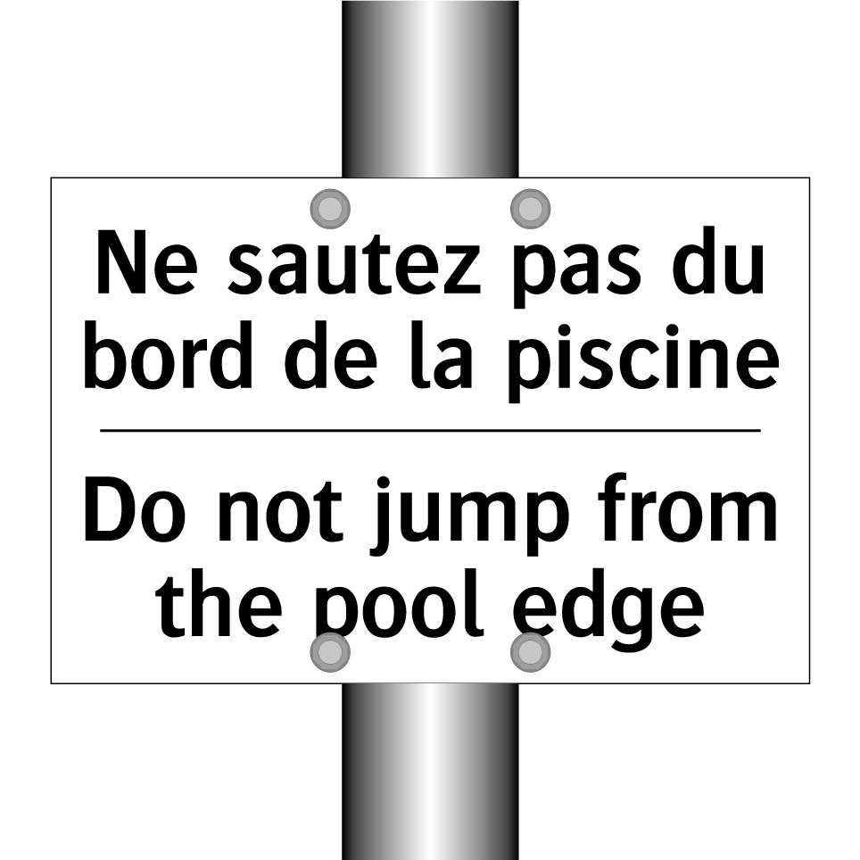 Panneau d'interdiction bilingue avec texte en français : "Ne sautez pas du bord de la piscine", et en anglais : "Do not jump from the pool edge"