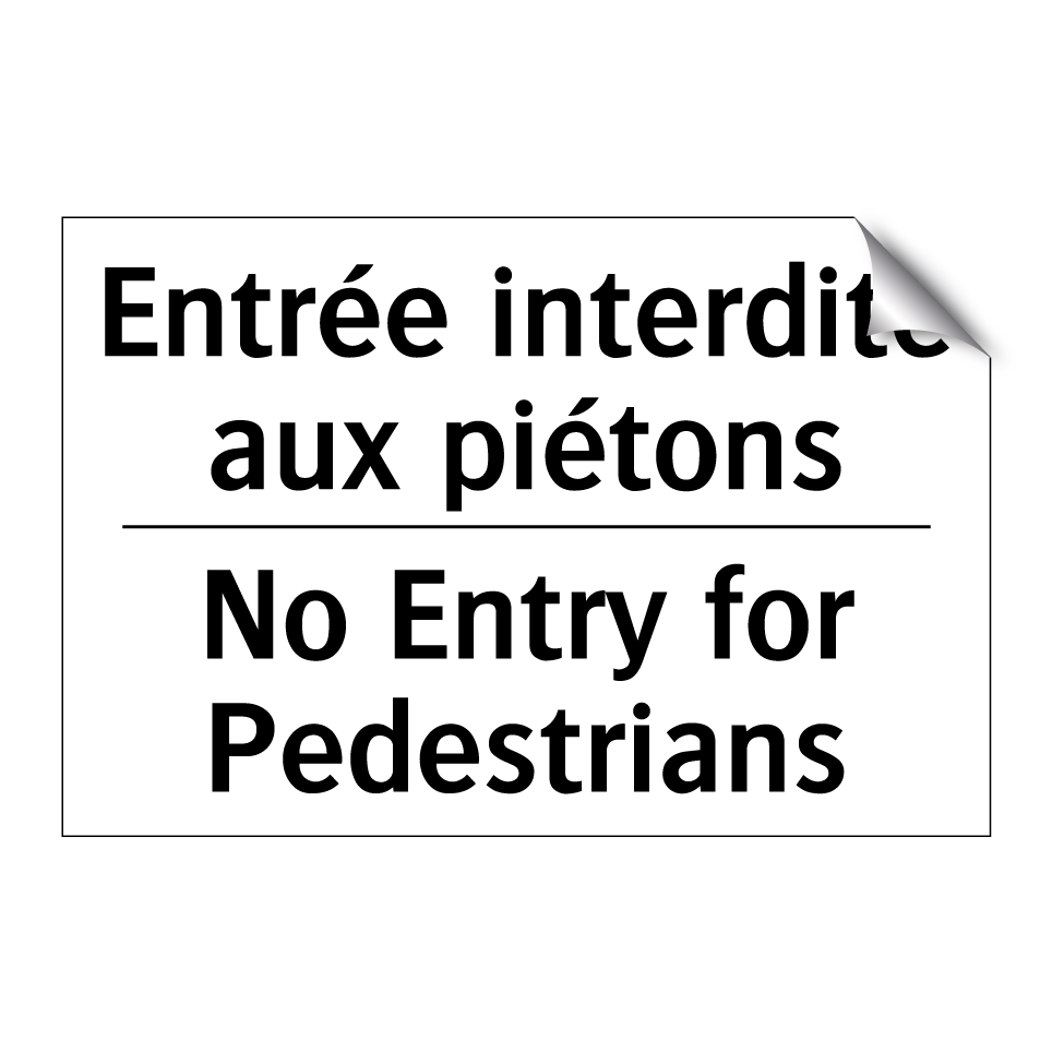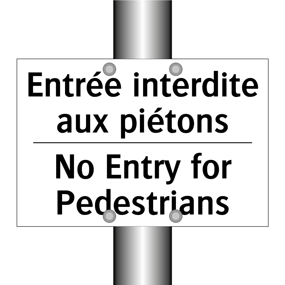 Panneau d'interdiction bilingue avec texte en français : "Entrée interdite aux piétons", et en anglais : "No Entry for Pedestrians"
