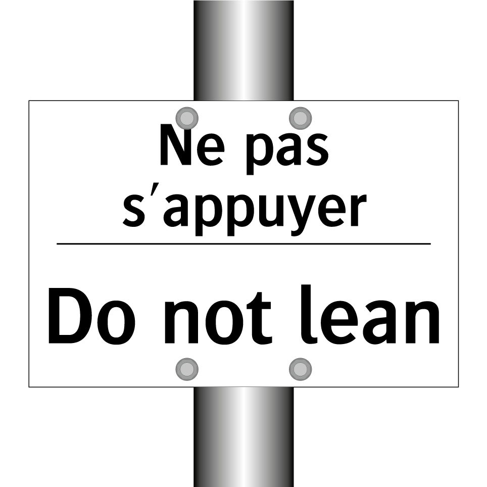 Panneau d'interdiction bilingue avec texte en français : "Ne pas s'appuyer", et en anglais : "Do not lean"