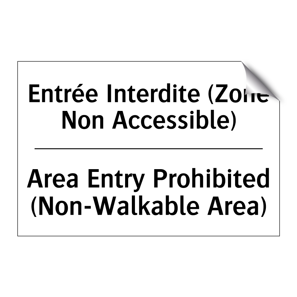 Panneau d'interdiction bilingue avec texte en français : "Entrée Interdite (Zone Non Accessible)", et en anglais : "Area Entry Prohibited (Non-Walkable Area)"