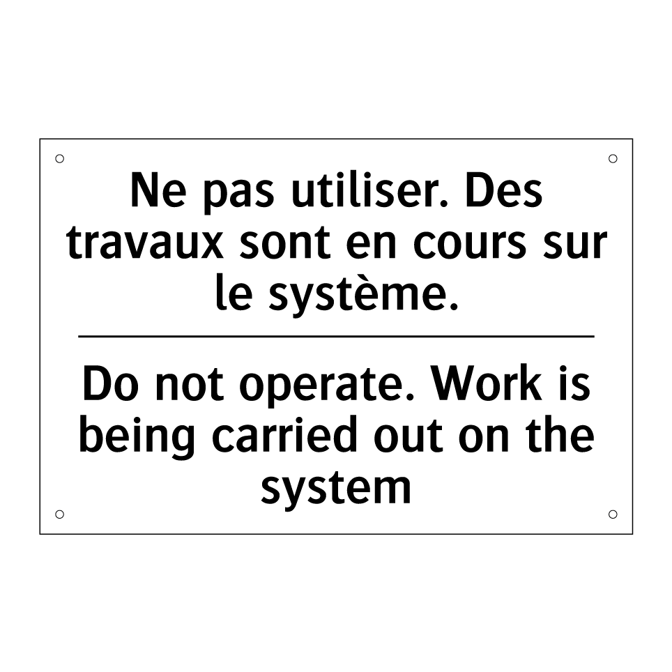 Panneau d'interdiction bilingue avec texte en français : "Ne pas utiliser. Des travaux sont en cours sur le système.", et en anglais : "Do not operate. Work is being carried out on the system"