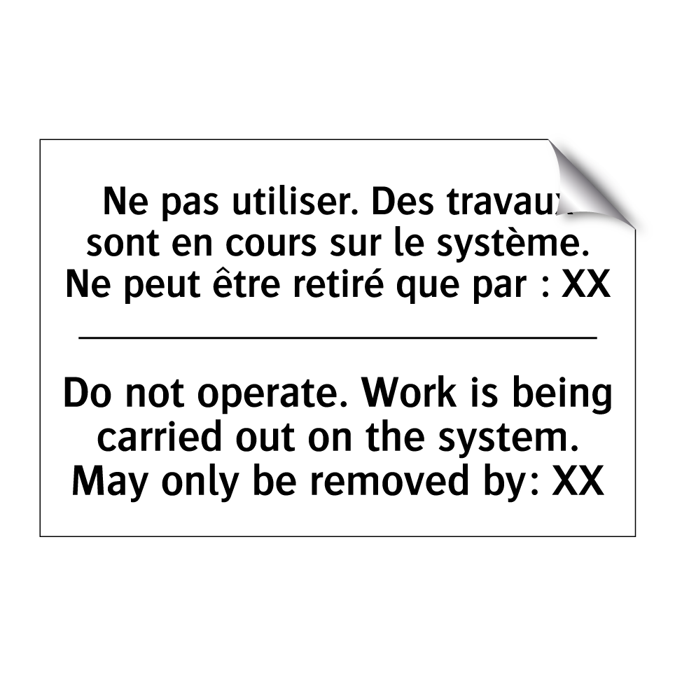 Panneau d'interdiction bilingue avec texte en français : "Ne pas utiliser. Des travaux sont en cours sur le système. Ne peut être retiré que par : XX", et en anglais : "Do not operate. Work is being carried out on the system. May only be removed by: XX"