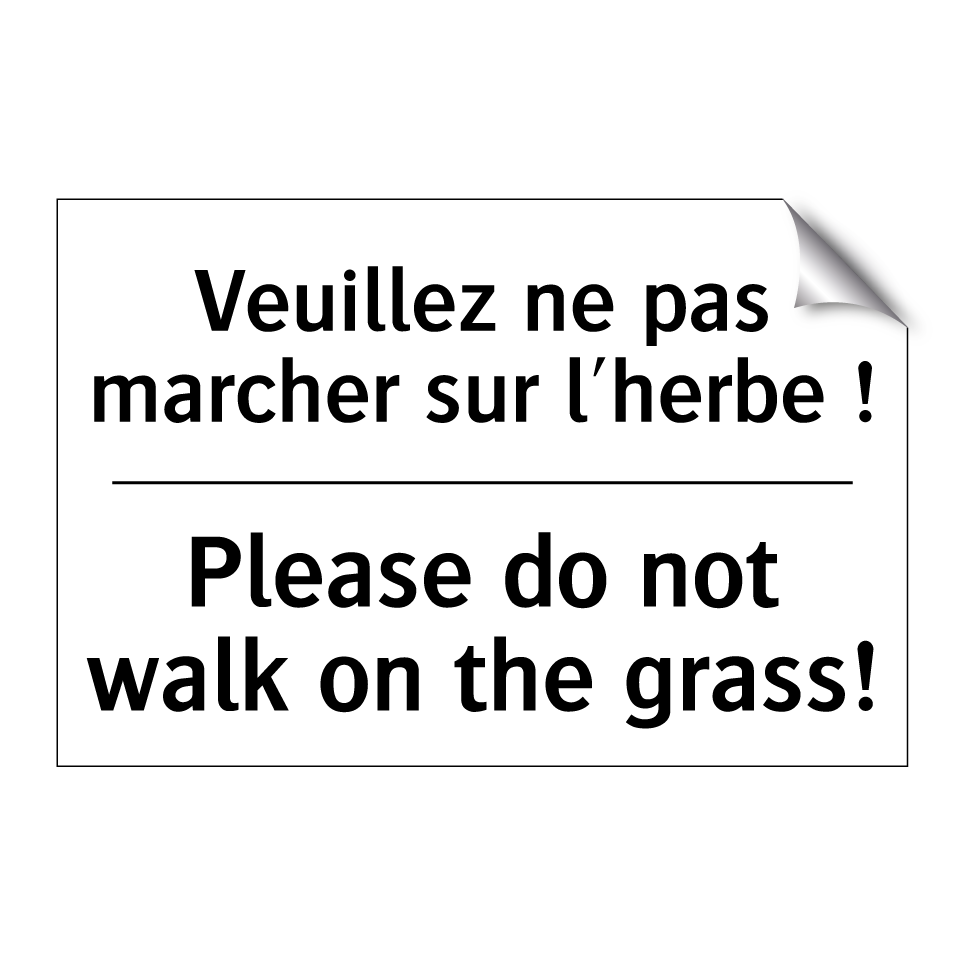 Panneau d'interdiction bilingue avec texte en français : "Veuillez ne pas marcher sur l'herbe !", et en anglais : "Please do not walk on the grass!"