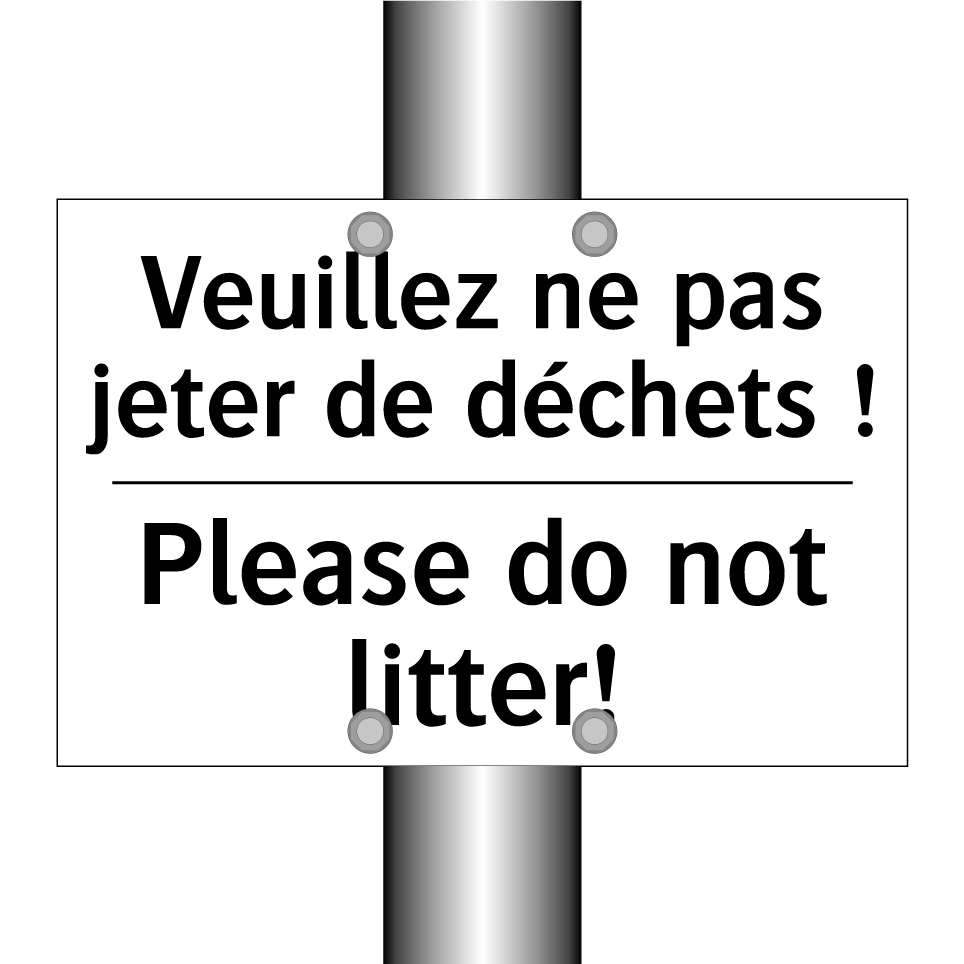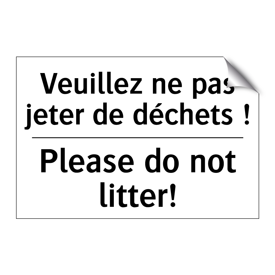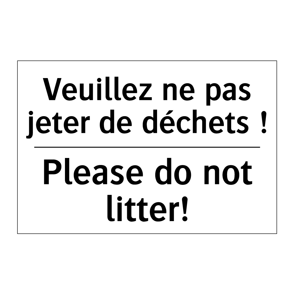 Panneau d'interdiction bilingue avec texte en français : "Veuillez ne pas jeter de déchets !", et en anglais : "Please do not litter!"