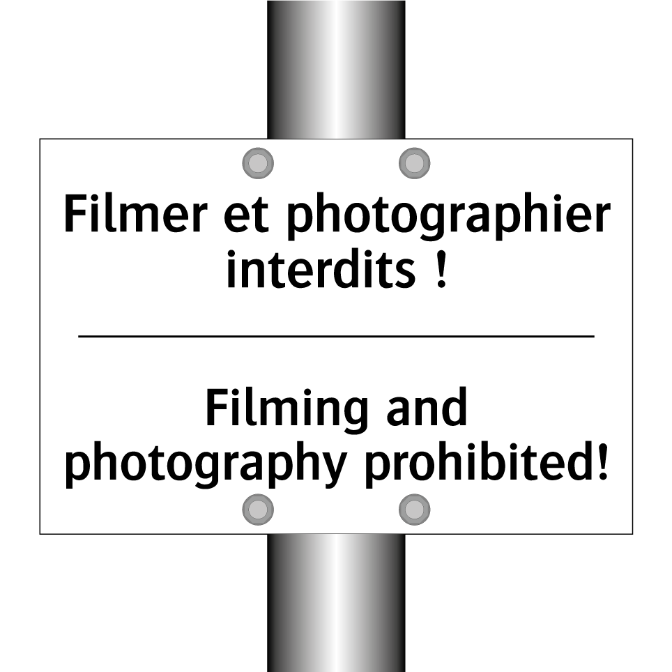 Panneau d'interdiction bilingue avec texte en français : "Filmer et photographier interdits !", et en anglais : "Filming and photography prohibited!"