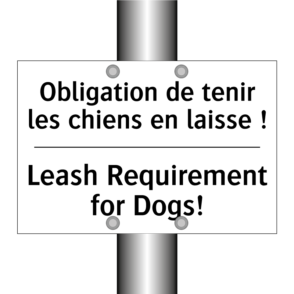 Panneau d'interdiction bilingue avec texte en français : "Obligation de tenir les chiens en laisse !", et en anglais : "Leash Requirement for Dogs!"