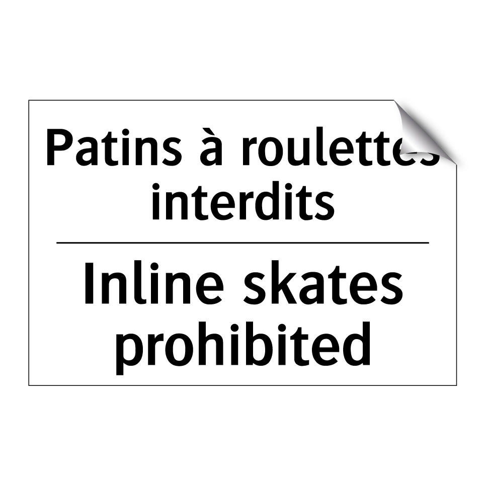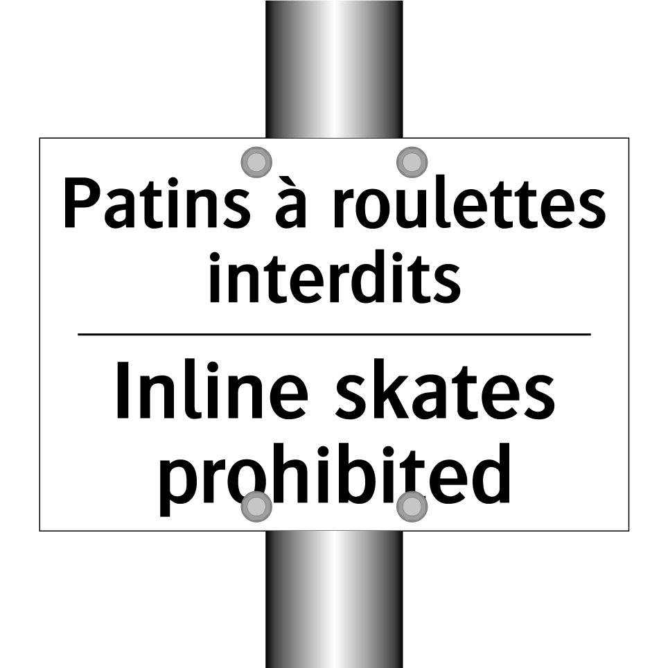 Panneau d'interdiction bilingue avec texte en français : "Patins à roulettes interdits", et en anglais : "Inline skates prohibited"