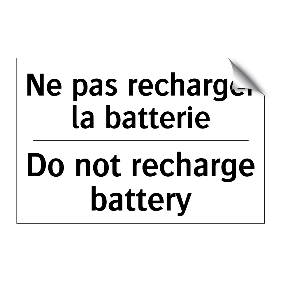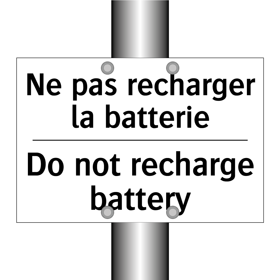 Panneau d'interdiction bilingue avec texte en français : "Ne pas recharger la batterie", et en anglais : "Do not recharge battery"