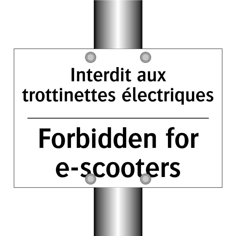 Panneau d'interdiction bilingue avec texte en français : "Interdit aux trottinettes électriques", et en anglais : "Forbidden for e-scooters"