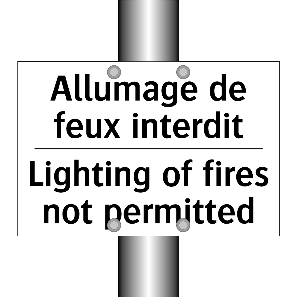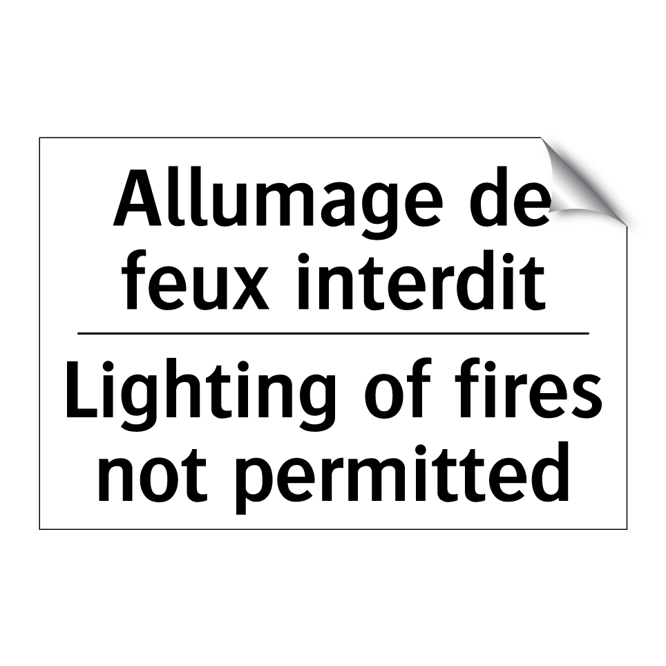 Panneau d'interdiction bilingue avec texte en français : "Allumage de feux interdit", et en anglais : "Lighting of fires not permitted"