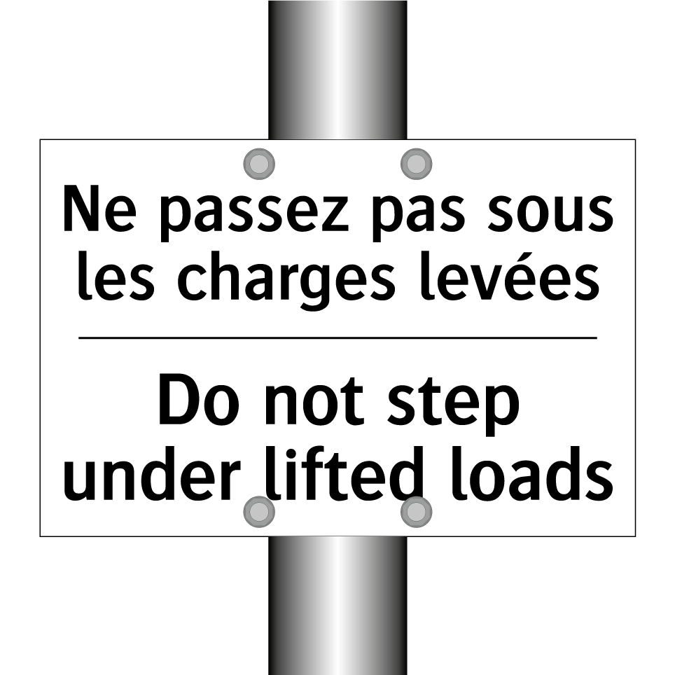 Panneau d'interdiction bilingue avec texte en français : "Ne passez pas sous les charges levées", et en anglais : "Do not step under lifted loads"