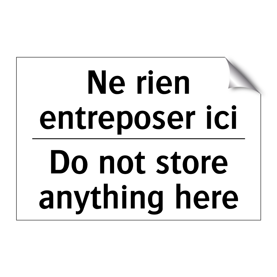 Panneau d'interdiction bilingue avec texte en français : "Ne rien entreposer ici", et en anglais : "Do not store anything here"