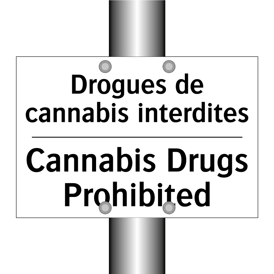 Panneau d'interdiction bilingue avec texte en français : "Drogues de cannabis interdites", et en anglais : "Cannabis Drugs Prohibited"