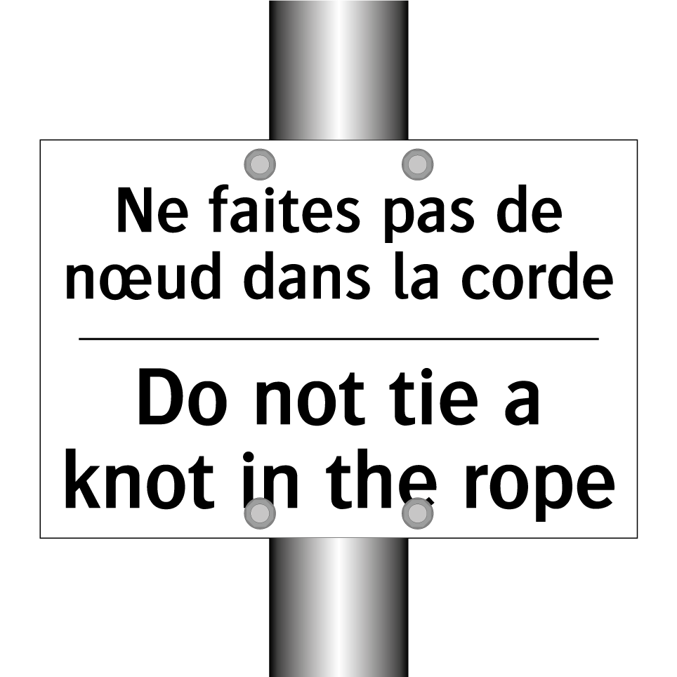Panneau d'interdiction bilingue avec texte en français : "Ne faites pas de nœud dans la corde", et en anglais : "Do not tie a knot in the rope"