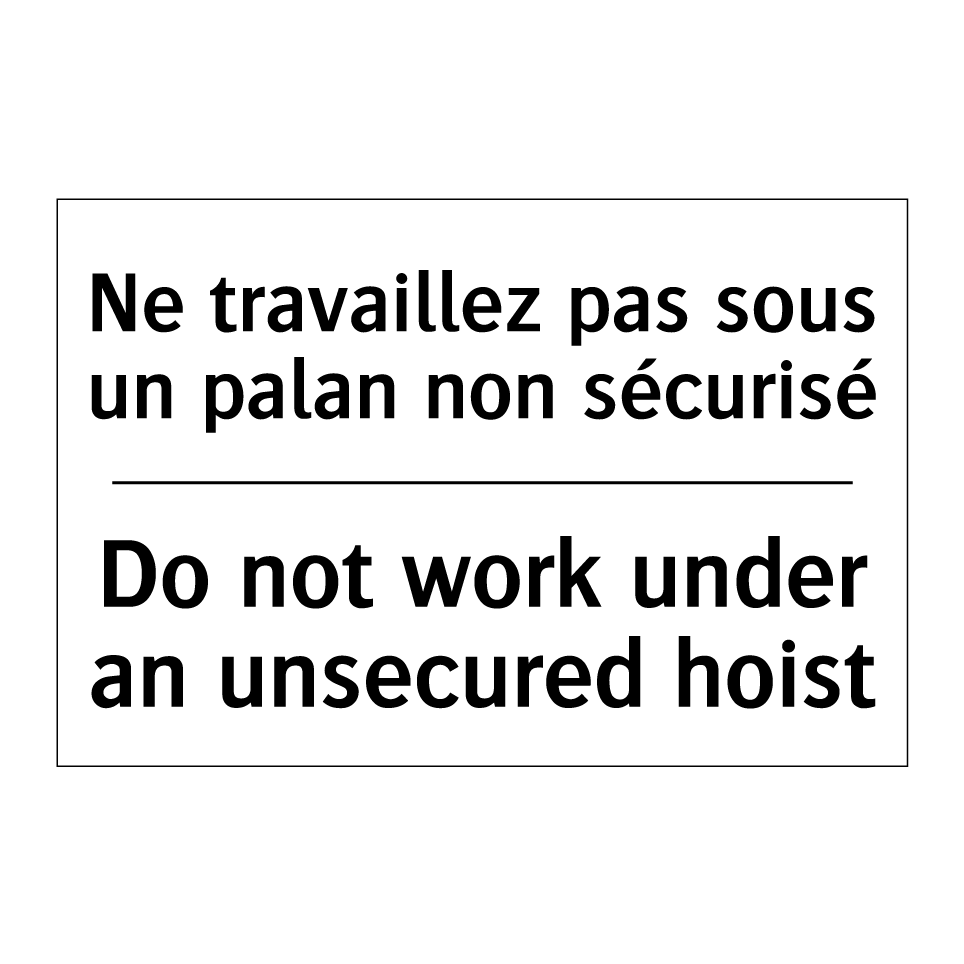 Panneau d'interdiction bilingue avec texte en français : "Ne travaillez pas sous un palan non sécurisé", et en anglais : "Do not work under an unsecured hoist"
