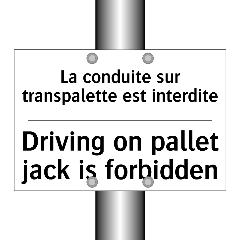 Panneau d'interdiction bilingue avec texte en français : "La conduite sur transpalette est interdite", et en anglais : "Driving on pallet jack is forbidden"