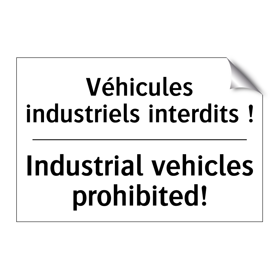 Panneau d'interdiction bilingue avec texte en français : "Véhicules industriels interdits !", et en anglais : "Industrial vehicles prohibited!"