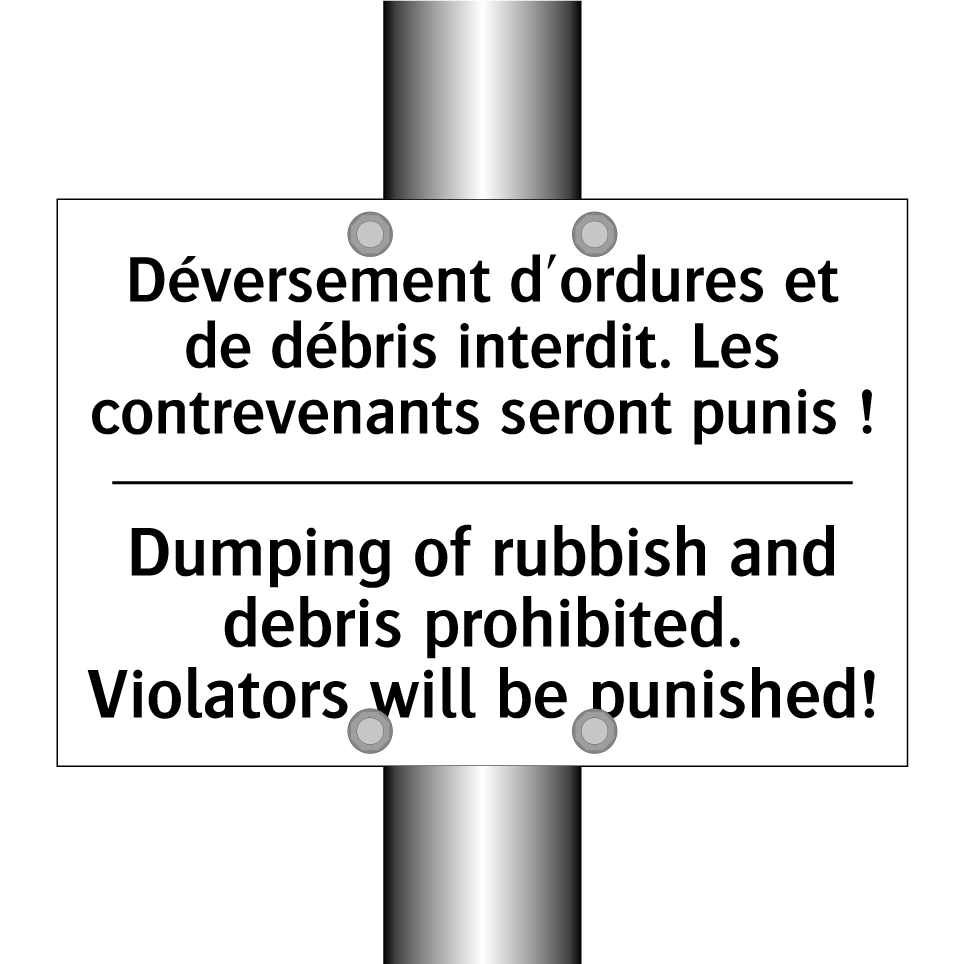 Panneau d'interdiction bilingue avec texte en français : "Déversement d'ordures et de débris interdit. Les contrevenants seront punis !", et en anglais : "Dumping of rubbish and debris prohibited. Violators will be punished!"