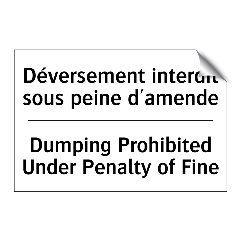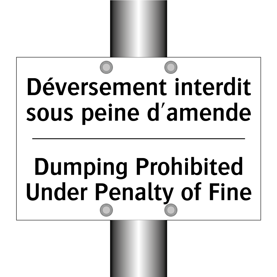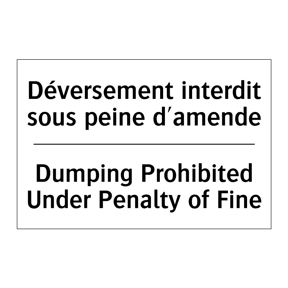 Panneau d'interdiction bilingue avec texte en français : "Déversement interdit sous peine d'amende", et en anglais : "Dumping Prohibited Under Penalty of Fine"