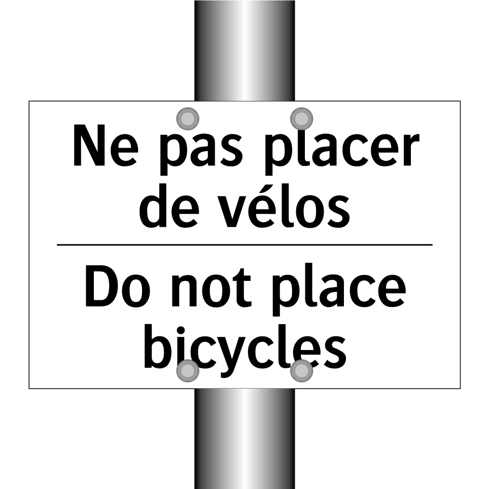 Panneau d'interdiction bilingue avec texte en français : "Ne pas placer de vélos", et en anglais : "Do not place bicycles"