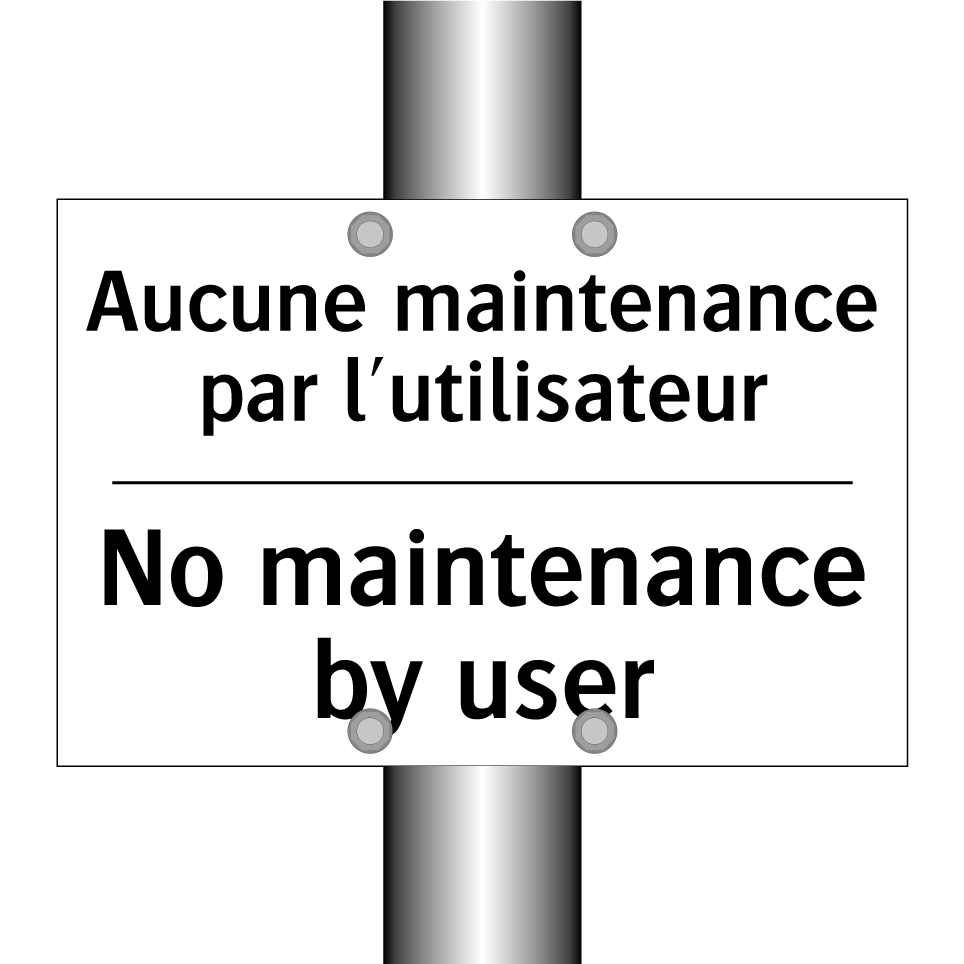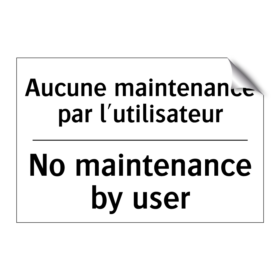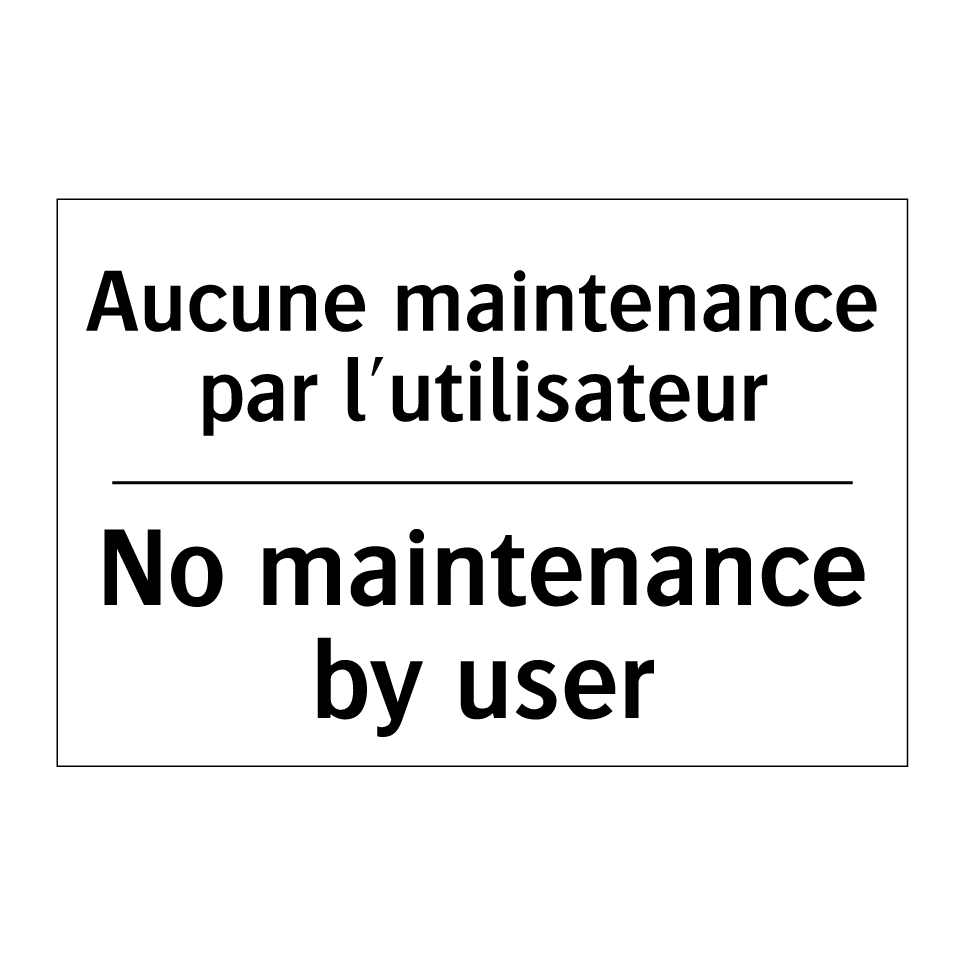 Panneau d'interdiction bilingue avec texte en français : "Aucune maintenance par l'utilisateur", et en anglais : "No maintenance by user"