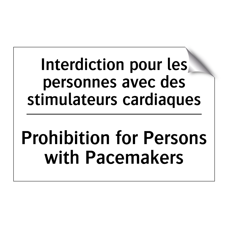 Panneau d'interdiction bilingue avec texte en français : "Interdiction pour les personnes avec des stimulateurs cardiaques", et en anglais : "Prohibition for Persons with Pacemakers"