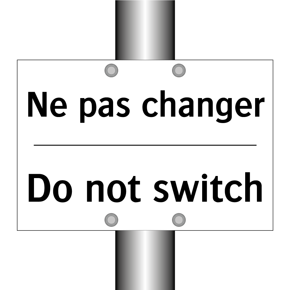 Panneau d'interdiction bilingue avec texte en français : "Ne pas changer", et en anglais : "Do not switch"