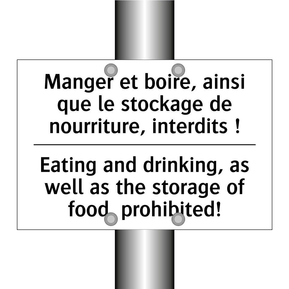 Panneau d'interdiction bilingue avec texte en français : "Manger et boire, ainsi que le stockage de nourriture, interdits !", et en anglais : "Eating and drinking, as well as the storage of food, prohibited!"