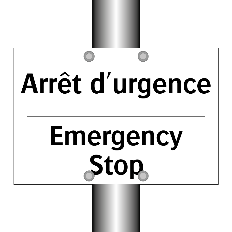 Panneau d'interdiction bilingue avec texte en français : "Arrêt d'urgence", et en anglais : "Emergency Stop"