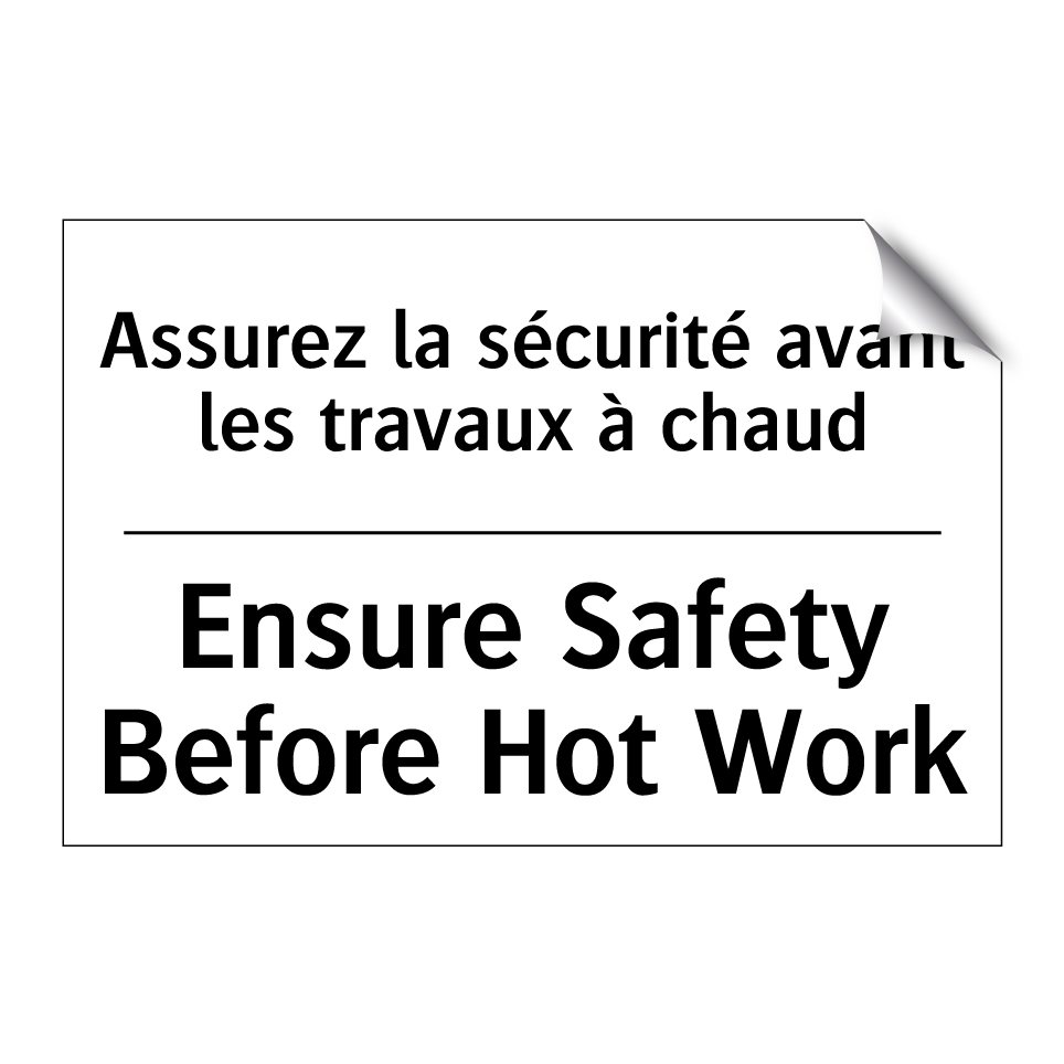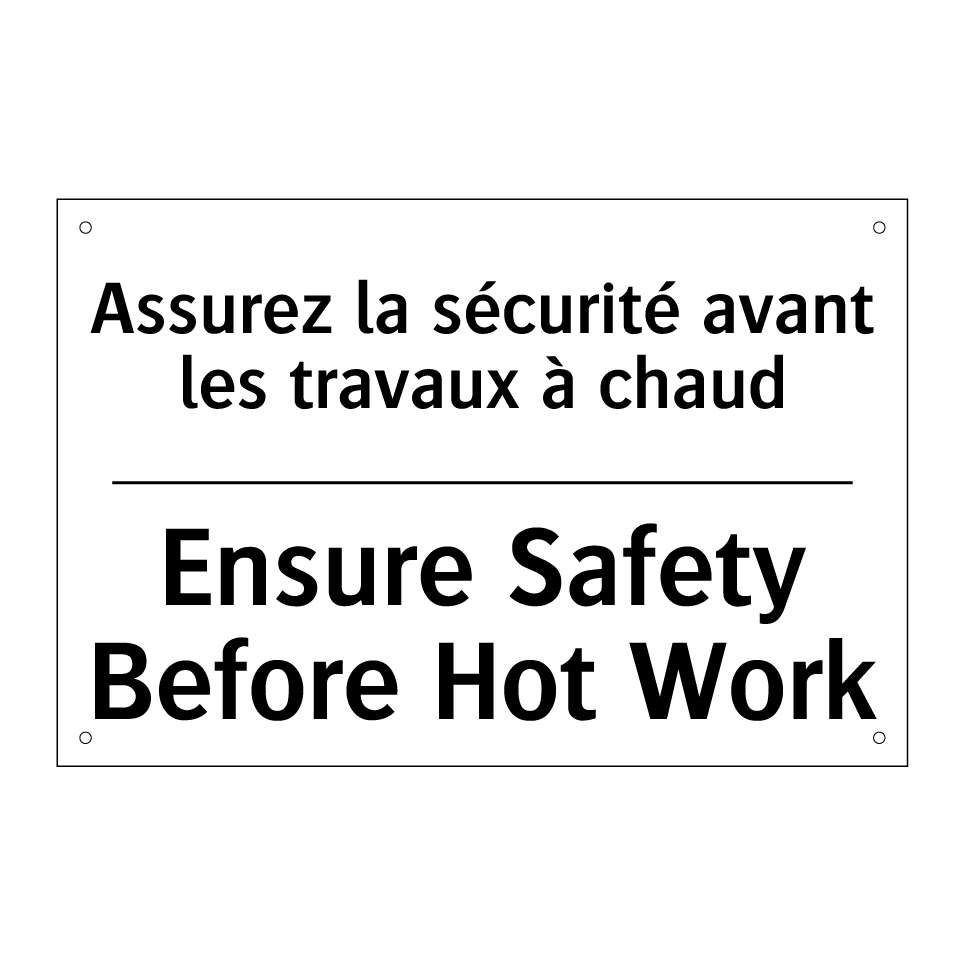 Panneau d'interdiction bilingue avec texte en français : "Assurez la sécurité avant les travaux à chaud", et en anglais : "Ensure Safety Before Hot Work"