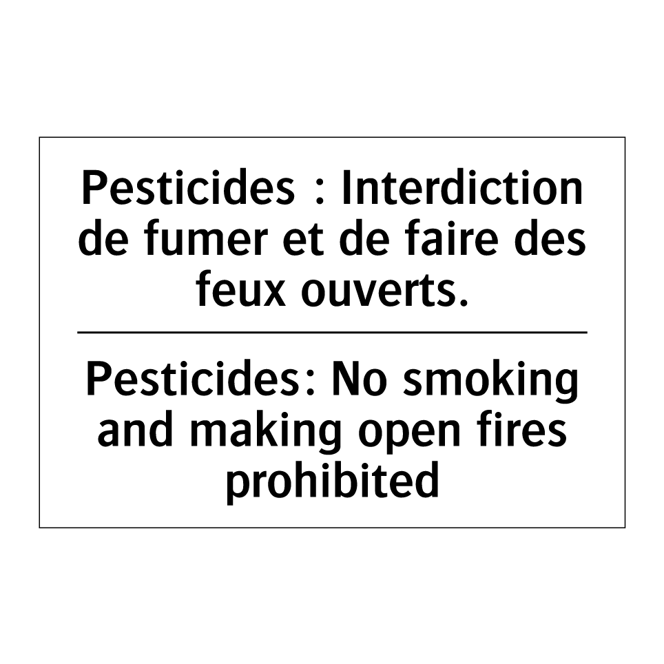 Panneau d'interdiction bilingue avec texte en français : "Pesticides : Interdiction de fumer et de faire des feux ouverts.", et en anglais : "Pesticides: No smoking and making open fires prohibited"