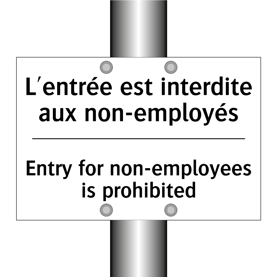 Panneau d'interdiction bilingue avec texte en français : "L'entrée est interdite aux non-employés", et en anglais : "Entry for non-employees is prohibited"