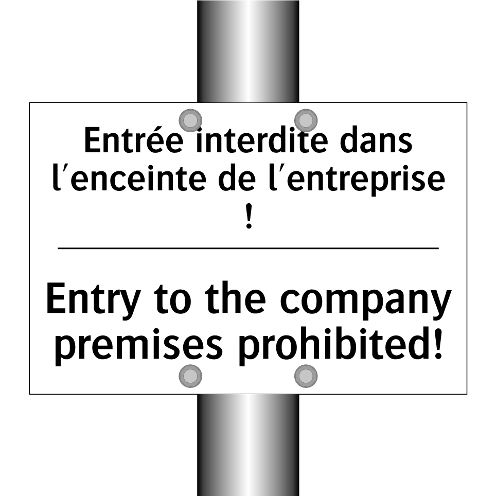 Panneau d'interdiction bilingue avec texte en français : "Entrée interdite dans l'enceinte de l'entreprise !", et en anglais : "Entry to the company premises prohibited!"
