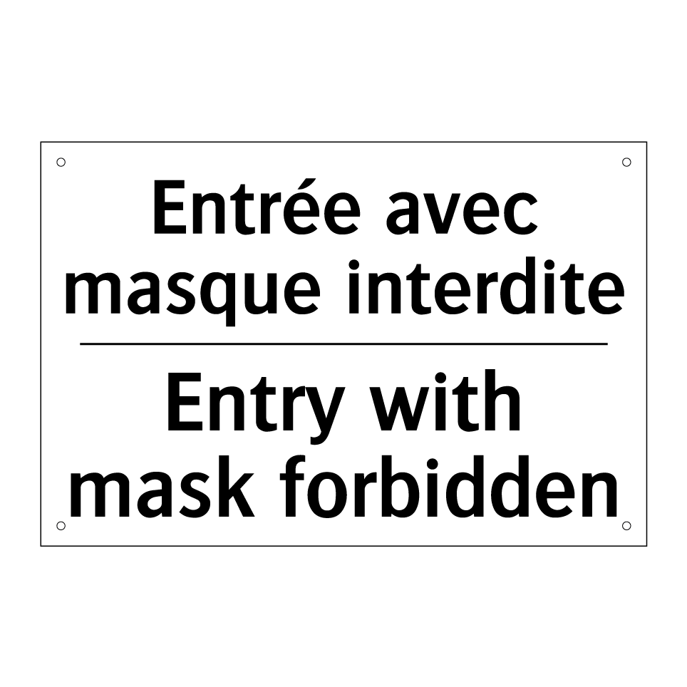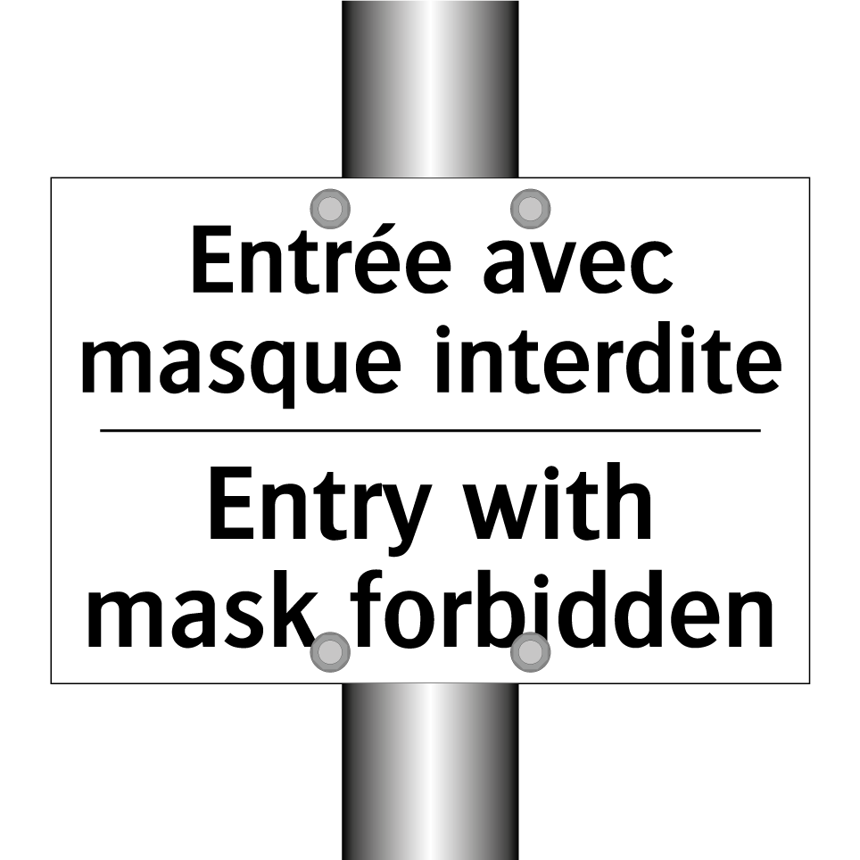 Panneau d'interdiction bilingue avec texte en français : "Entrée avec masque interdite", et en anglais : "Entry with mask forbidden"