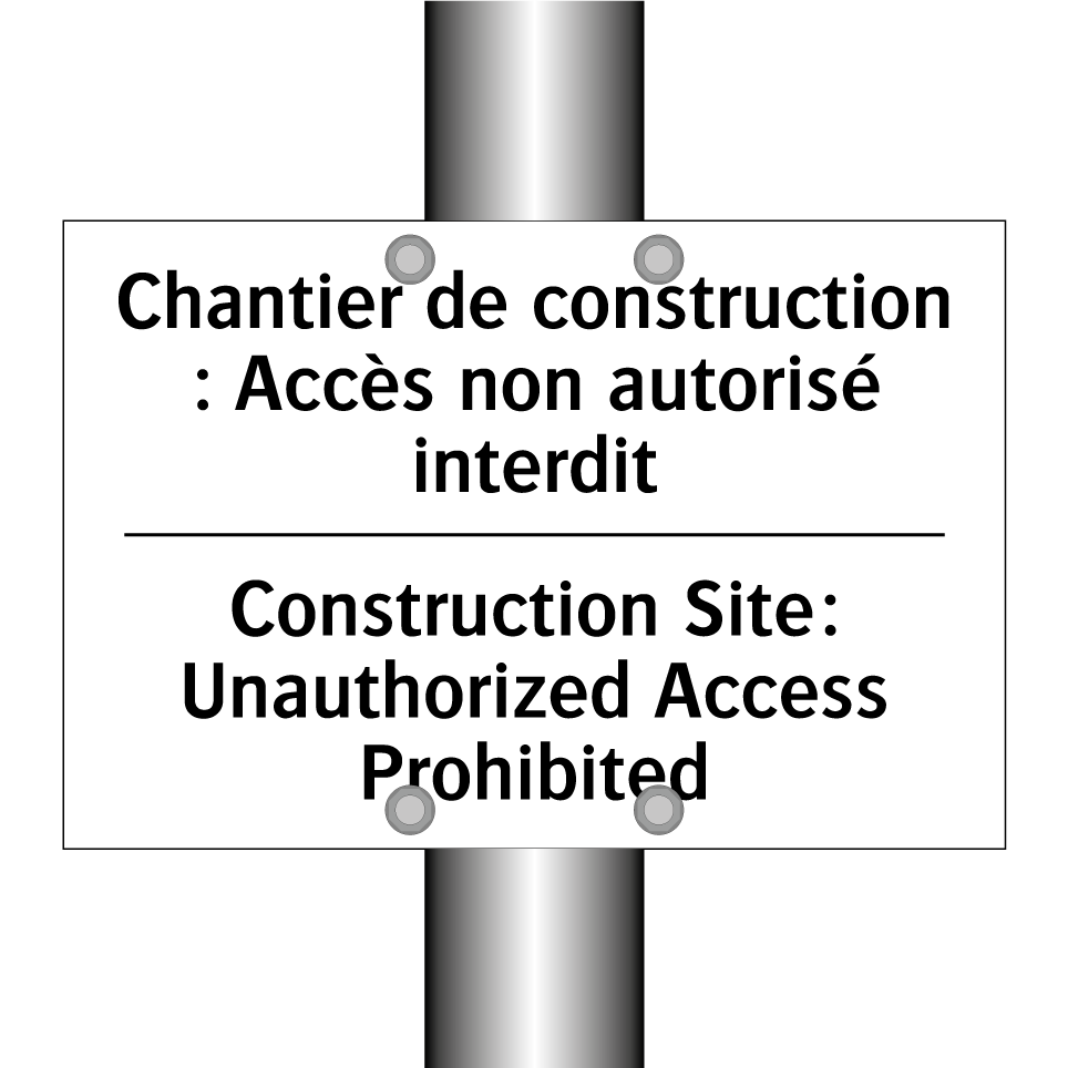 Panneau d'interdiction bilingue avec texte en français : "Chantier de construction : Accès non autorisé interdit", et en anglais : "Construction Site: Unauthorized Access Prohibited"