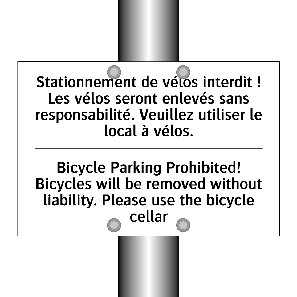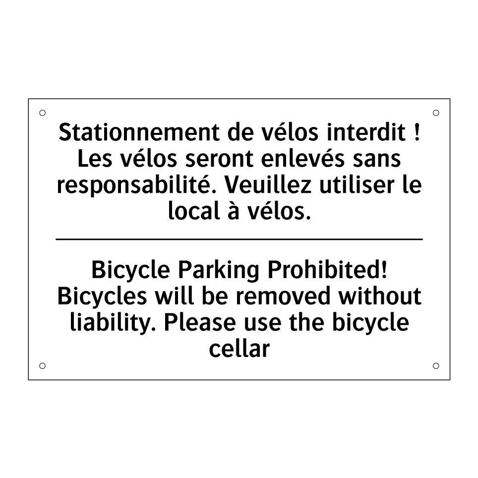 Panneau d'interdiction bilingue avec texte en français : "Stationnement de vélos interdit ! Les vélos seront enlevés sans responsabilité. Veuillez utiliser le local à vélos.", et en anglais : "Bicycle Parking Prohibited! Bicycles will be removed without liability. Please use the bicycle cellar"