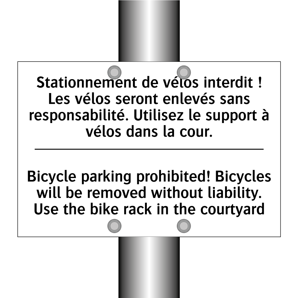 Panneau d'interdiction bilingue avec texte en français : "Stationnement de vélos interdit ! Les vélos seront enlevés sans responsabilité. Utilisez le support à vélos dans la cour.", et en anglais : "Bicycle parking prohibited! Bicycles will be removed without liability. Use the bike rack in the courtyard"