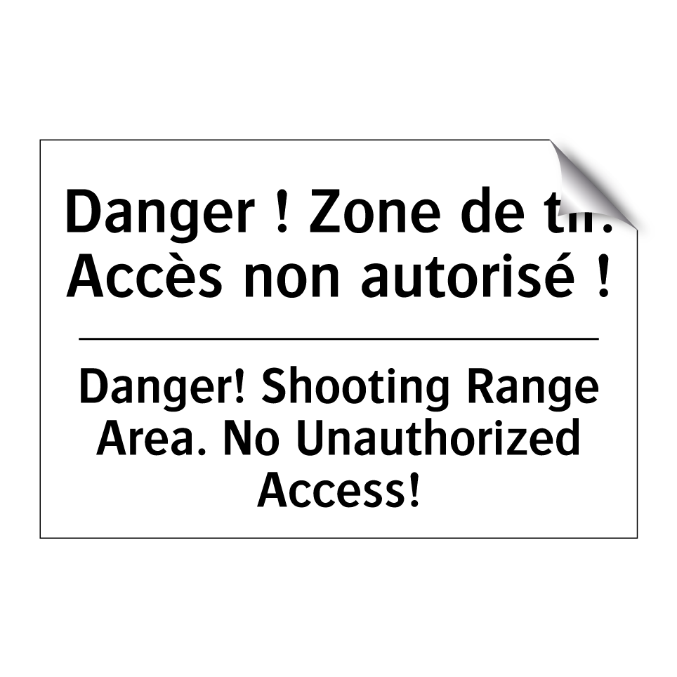 Panneau d'interdiction bilingue avec texte en français : "Danger ! Zone de tir. Accès non autorisé !", et en anglais : "Danger! Shooting Range Area. No Unauthorized Access!"