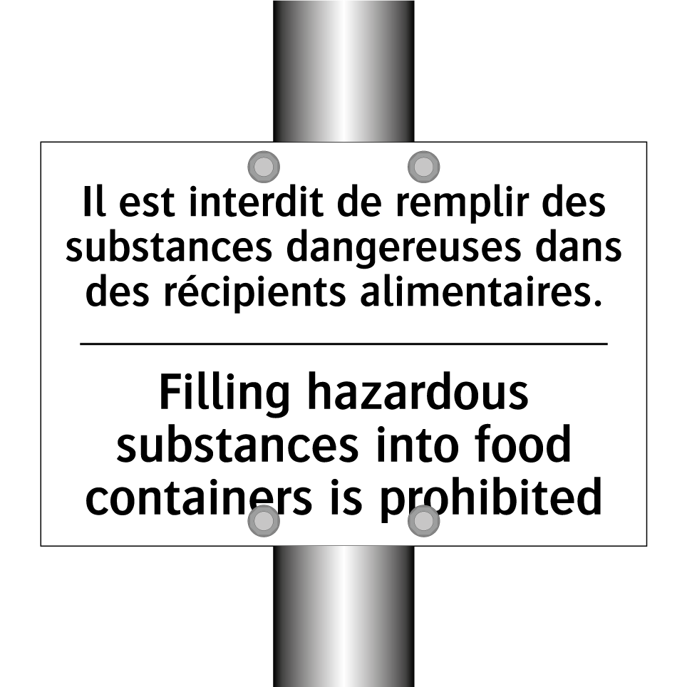 Panneau d'interdiction bilingue avec texte en français : "Il est interdit de remplir des substances dangereuses dans des récipients alimentaires.", et en anglais : "Filling hazardous substances into food containers is prohibited"