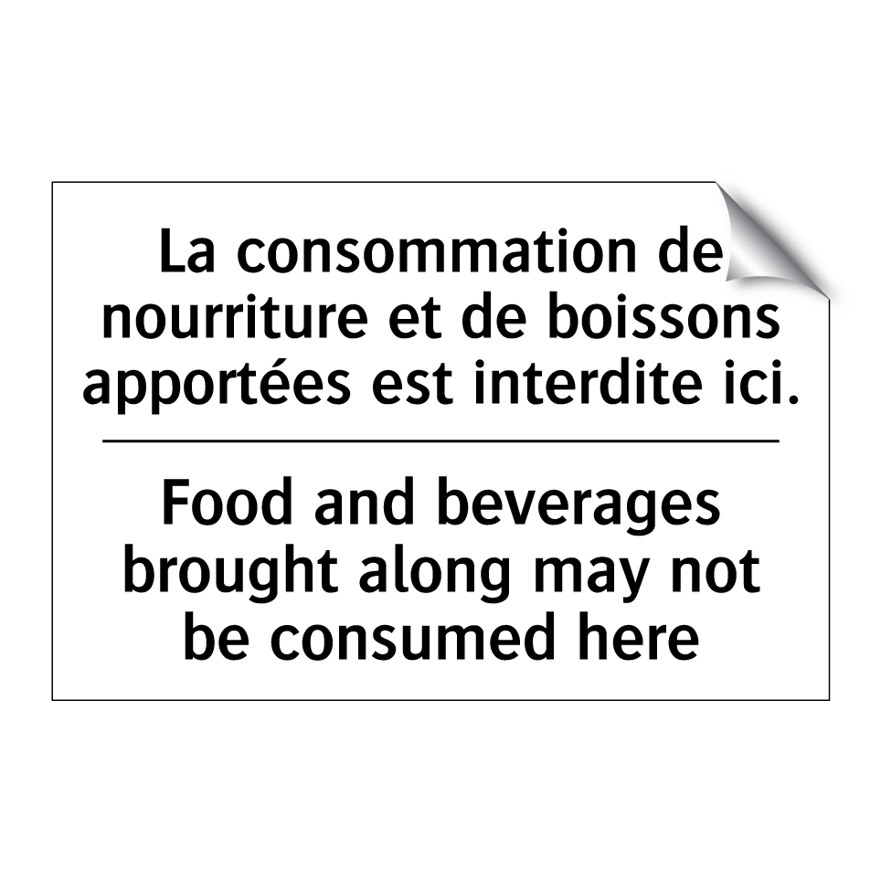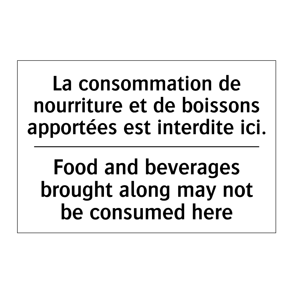 Panneau d'interdiction bilingue avec texte en français : "La consommation de nourriture et de boissons apportées est interdite ici.", et en anglais : "Food and beverages brought along may not be consumed here"