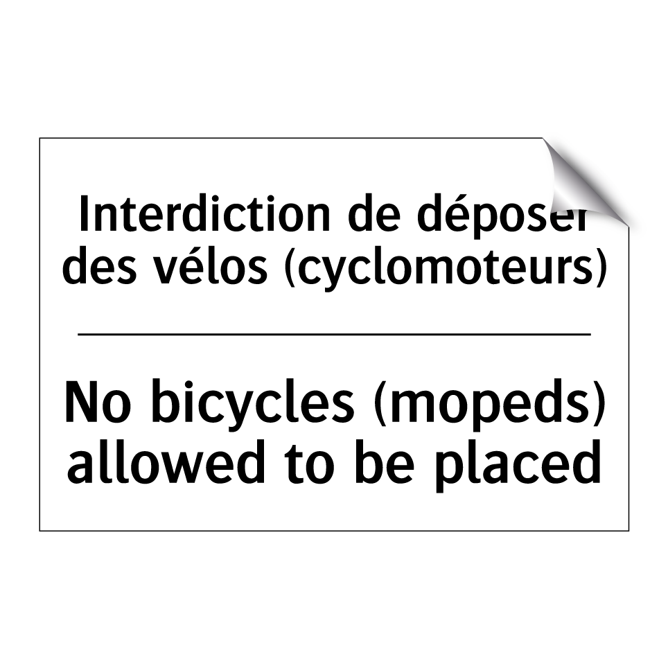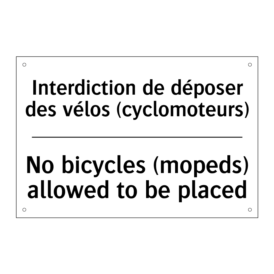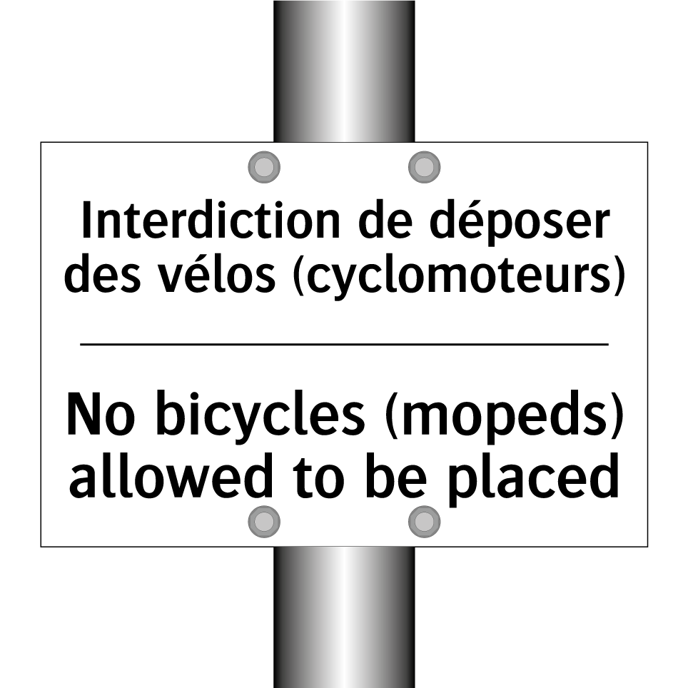 Panneau d'interdiction bilingue avec texte en français : "Interdiction de déposer des vélos (cyclomoteurs)", et en anglais : "No bicycles (mopeds) allowed to be placed"