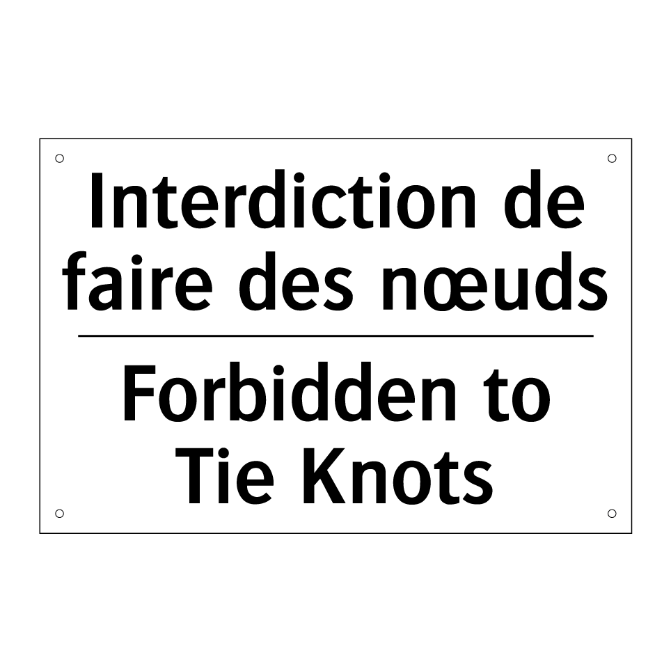 Panneau d'interdiction bilingue avec texte en français : "Interdiction de faire des nœuds", et en anglais : "Forbidden to Tie Knots"