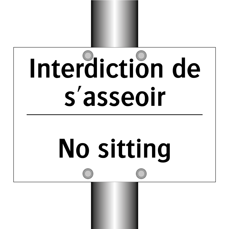 Panneau d'interdiction bilingue avec texte en français : "Interdiction de s'asseoir", et en anglais : "No sitting"
