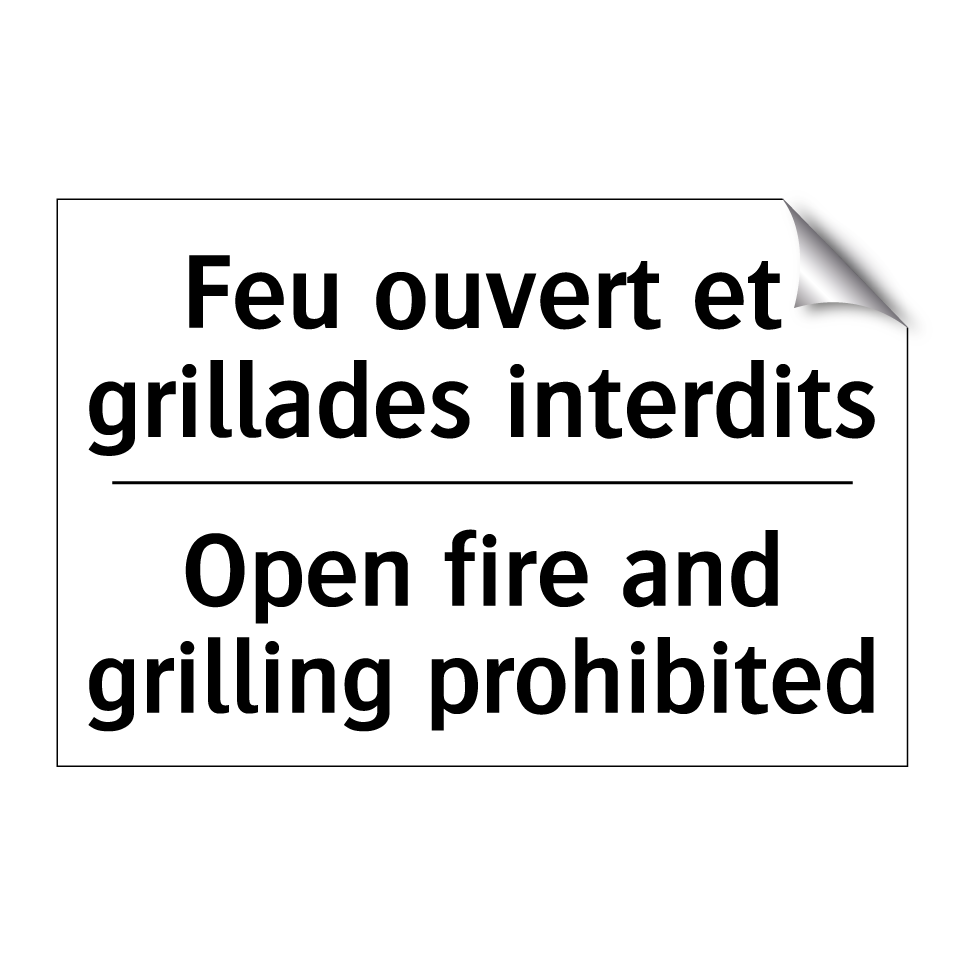 Panneau d'interdiction bilingue avec texte en français : "Feu ouvert et grillades interdits", et en anglais : "Open fire and grilling prohibited"
