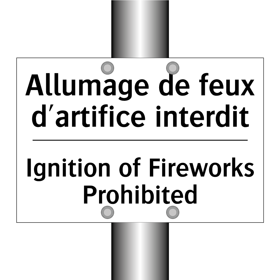 Panneau d'interdiction bilingue avec texte en français : "Allumage de feux d'artifice interdit", et en anglais : "Ignition of Fireworks Prohibited"